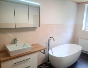 Separates, stilvoll ausgestattetes Badezimmer mit Designerbadewanne